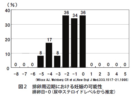 答 我が国で行われた臨床試験は例数が少ないので、海外における成績を紹介します。性交後72時間以内の女性1,198例にLNG―ECP1.5mgを1回投与した際の妊娠率(妊娠例数/評価症例数)は1.34%、妊娠阻止率は84%でした。ちなみに妊娠阻止率ですが、LNG―ECP 服用者の排卵日(0)が月経周期14日目であると仮定した場合、妊娠の可能性についてWilcox らは図2のように排卵5日前から当日までであるとしています。それぞれの日の妊娠予定数を計算した上で、妊娠阻止率=(妊娠予定数-実際の妊娠例数)÷妊娠予定数×100(%)として求めます。