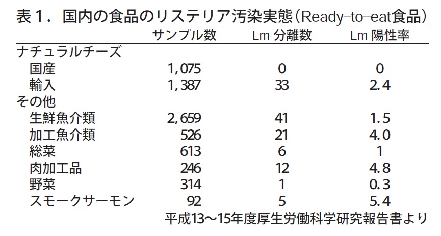 国内のRTE 食品の汚染率は食品毎0~5.4%程度(表1)であり、一般に汚染菌数は低いため食品からの検出には増菌が必要である。RTE 食品の汚染状況などから、低い菌数のリステリアのヒトへの曝露はそれほど稀ではなく起こっており、ほとんどの場合、感染に至らずに推移しているものと思われる。リステリアに感染した家畜からは糞便中にリステリアが排菌されており、土壌や野菜を汚染する。殺菌前の生乳にはリステリアの汚染が見られるが、国内の飲用乳は加熱殺菌が義務づけられており市販の牛乳からの感染は知られていない。生肉におけるリステリアの汚染率は高い。牛、豚、鶏とも同様に汚染が見られ、枝肉から薄切り肉や挽肉へと加工が進むと汚染率が上がる傾向がある。