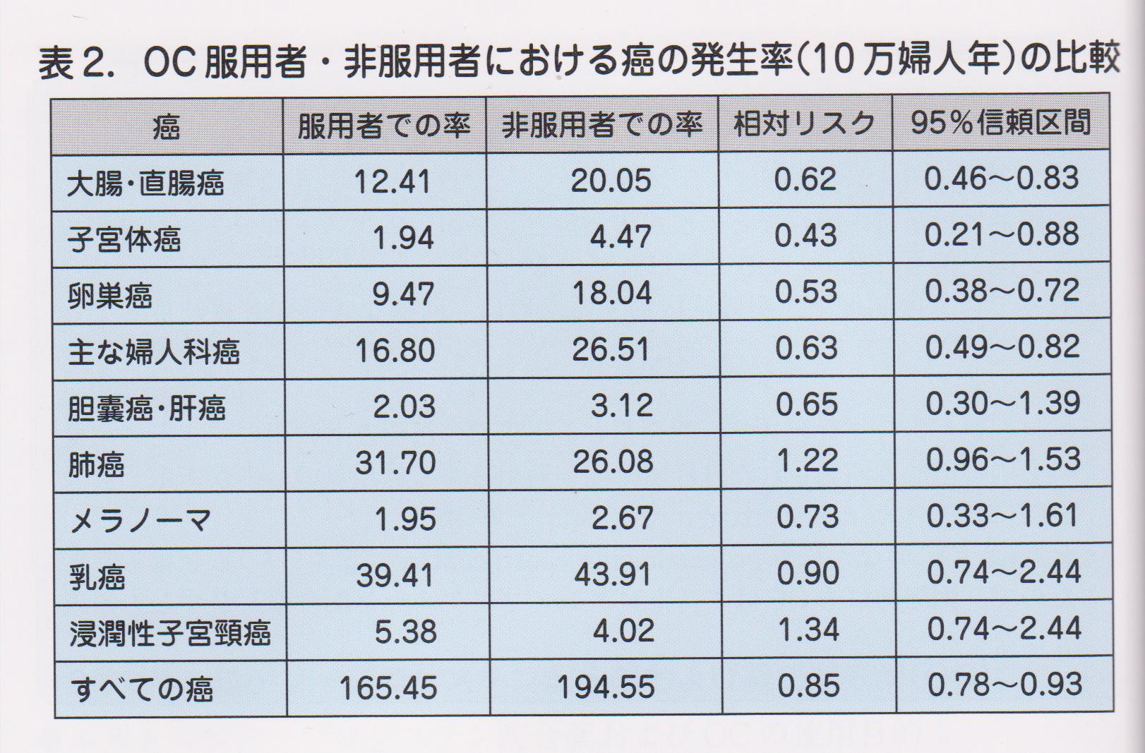 健常な女性が使用するため、長期的な安全性が重要である。OCにより乳癌・子宮頸癌の発症リスクが高まるといわれていたが、最近の大規模調査では両者ともリスクは上がらないとされる。OCの使用により、卵巣癌、子宮内膜癌(子宮体癌とも言われます:ブログ管理者註)、大腸癌の発症リスクは半減する。
